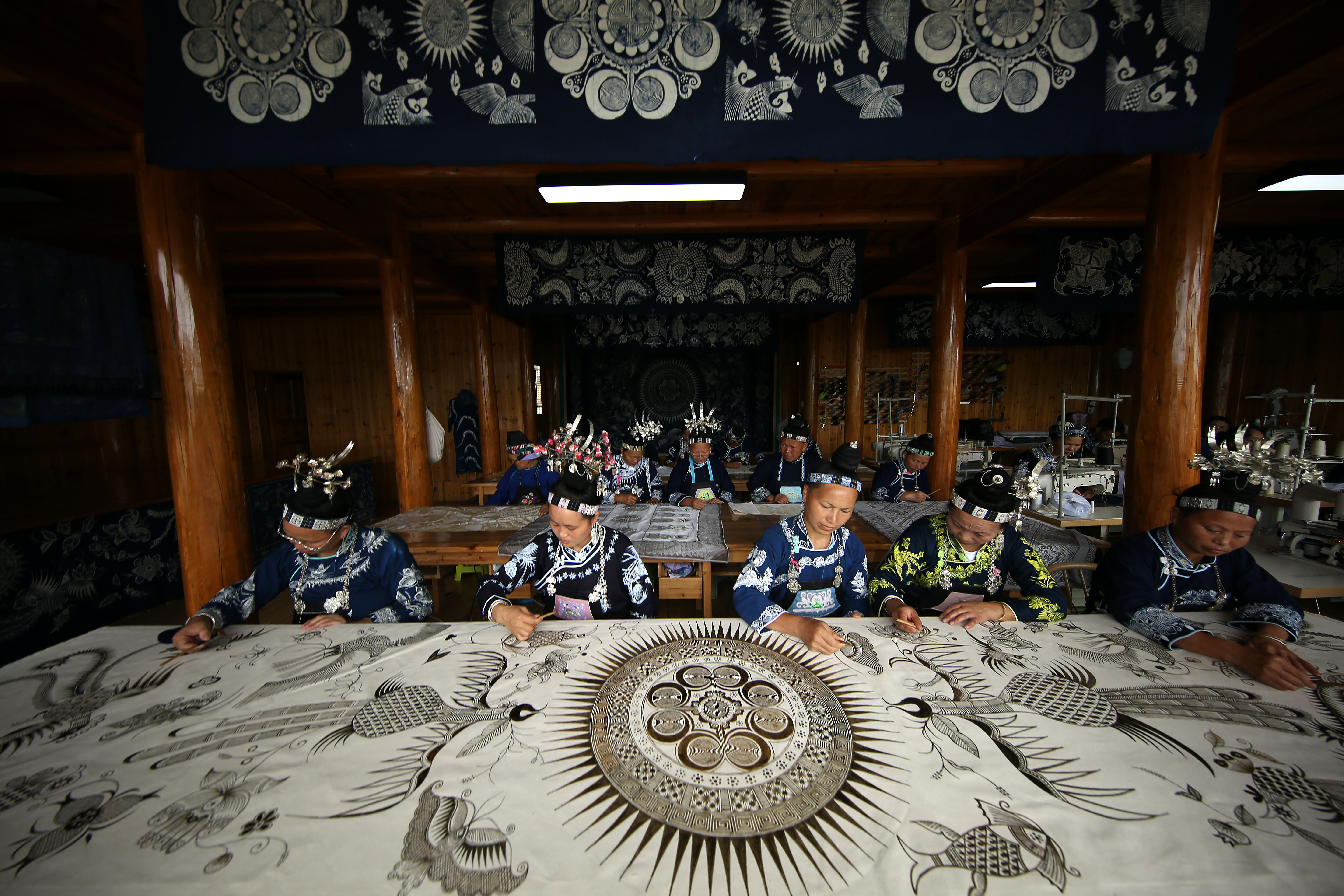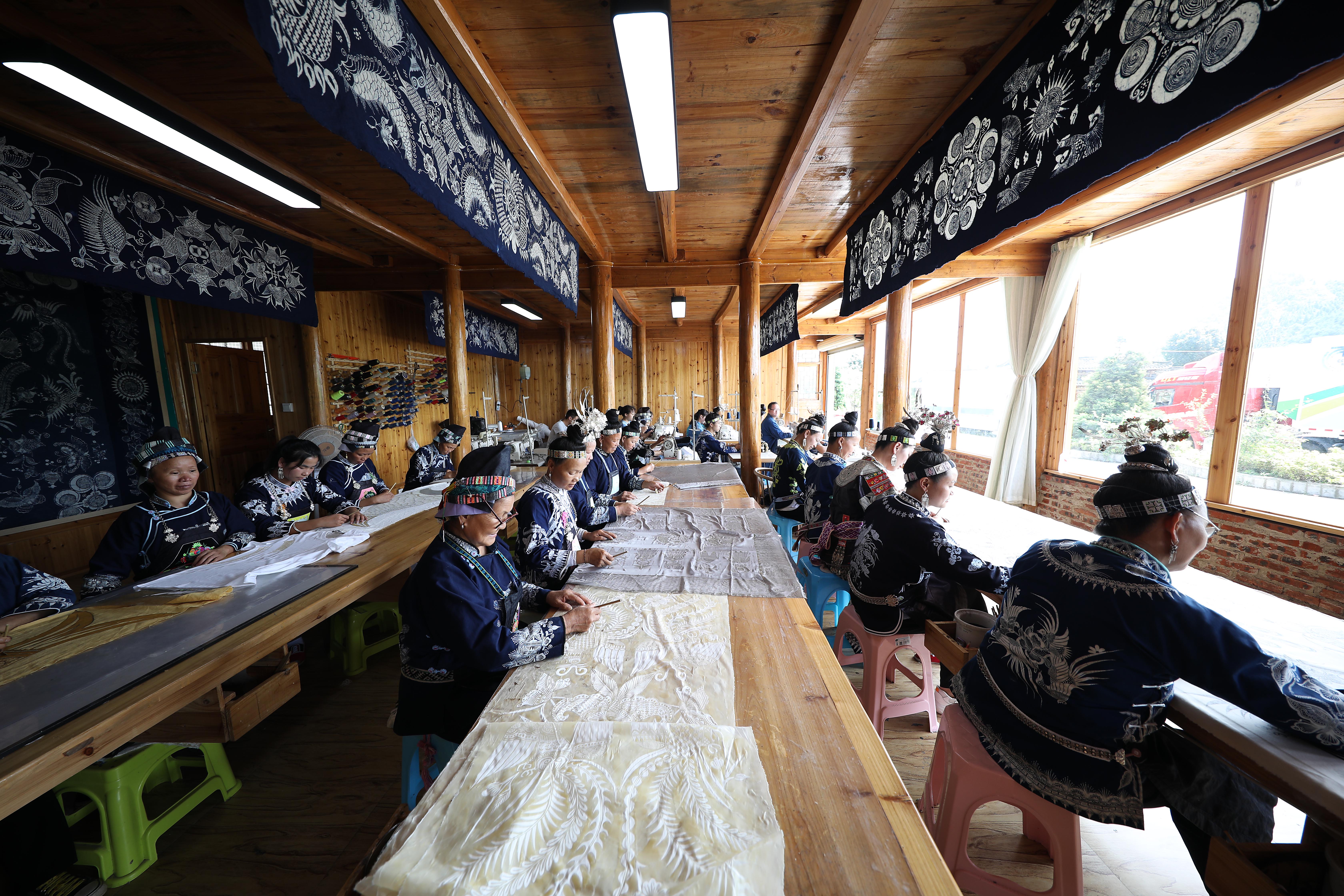 张义苹:现在,我们是以“公司+村合作社+农村妇女”的模式幅射带动了近200名老百姓就业。我希望工坊不仅能带动群众就业增收,还能通过向学生和游客传授蜡染技艺,也让更多年轻人了解贵州非遗。