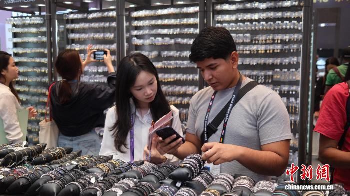 4月23日,广交会时尚饰品采购商洽谈采购细节。中新社记者 蔡敏婕 摄