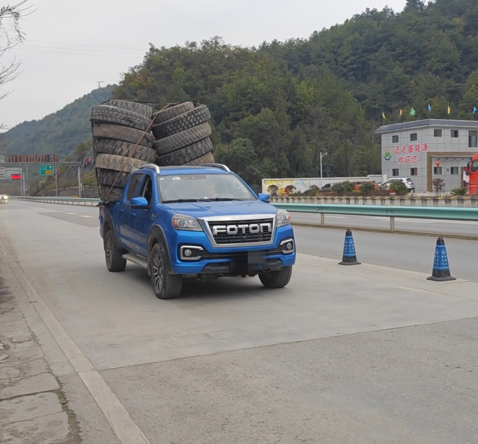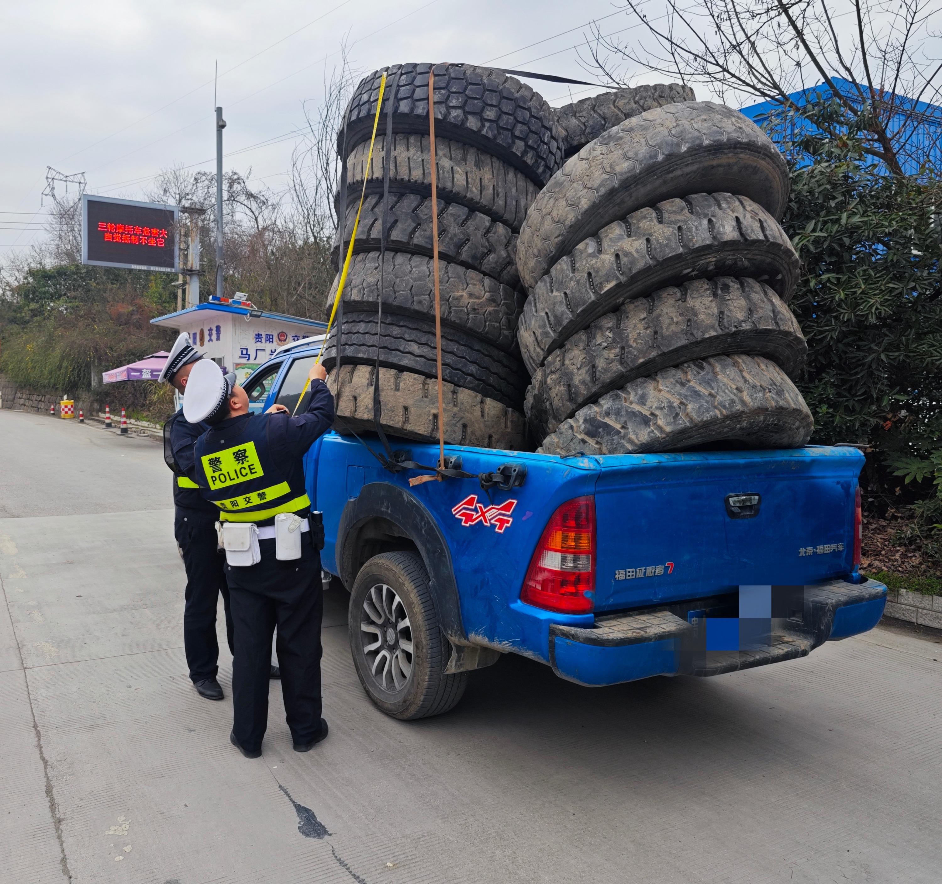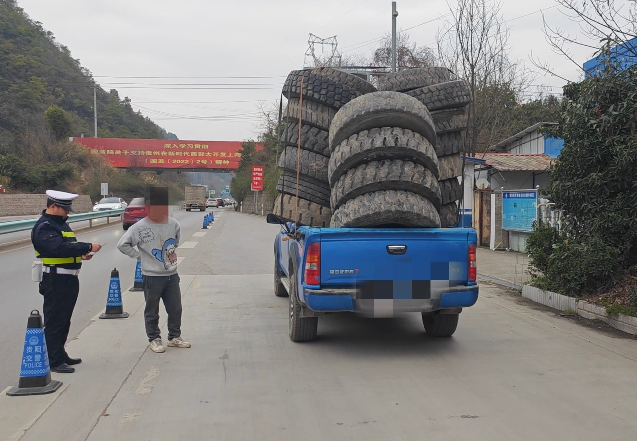 2023年3月4日下午17时30分,一辆贵A牌照的皮卡车拉着一车高耸的轮胎,摇摇晃晃的开进了云开路,正在云开路马厂岩执法站执勤的贵阳乌当交警二中队民警看到后,立即将该车拦停进行检查。