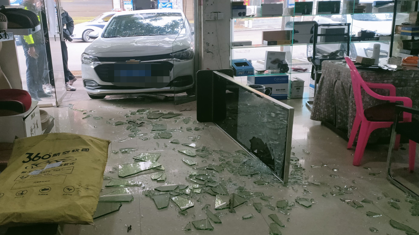 接警后,值班民警立即赶往现场,只见一辆白色雪佛兰牌小轿车停在一家汽车美容装饰店内,左侧车轮卡在墙上,店内满是被撞破的玻璃门碎片,一台广告投放机也被撞到在地,车辆受损较轻。据了解,司机罗某当天因为行车记录仪有点问题,就把车开到了汽车美容装饰店进行检查,结果却把老板的门给撞坏了。事后得知,原来是罗某当时想事情分心走神了,错把油门当刹车踩了一脚,才造成了此次事故。