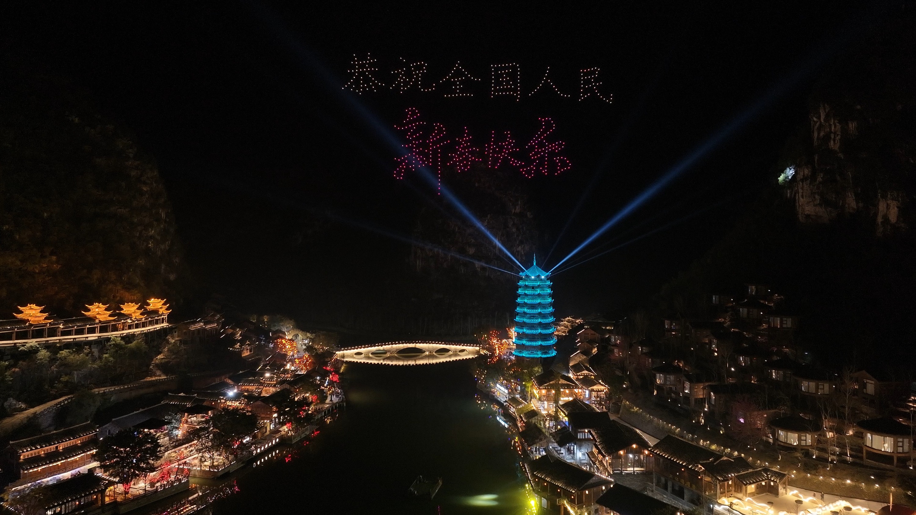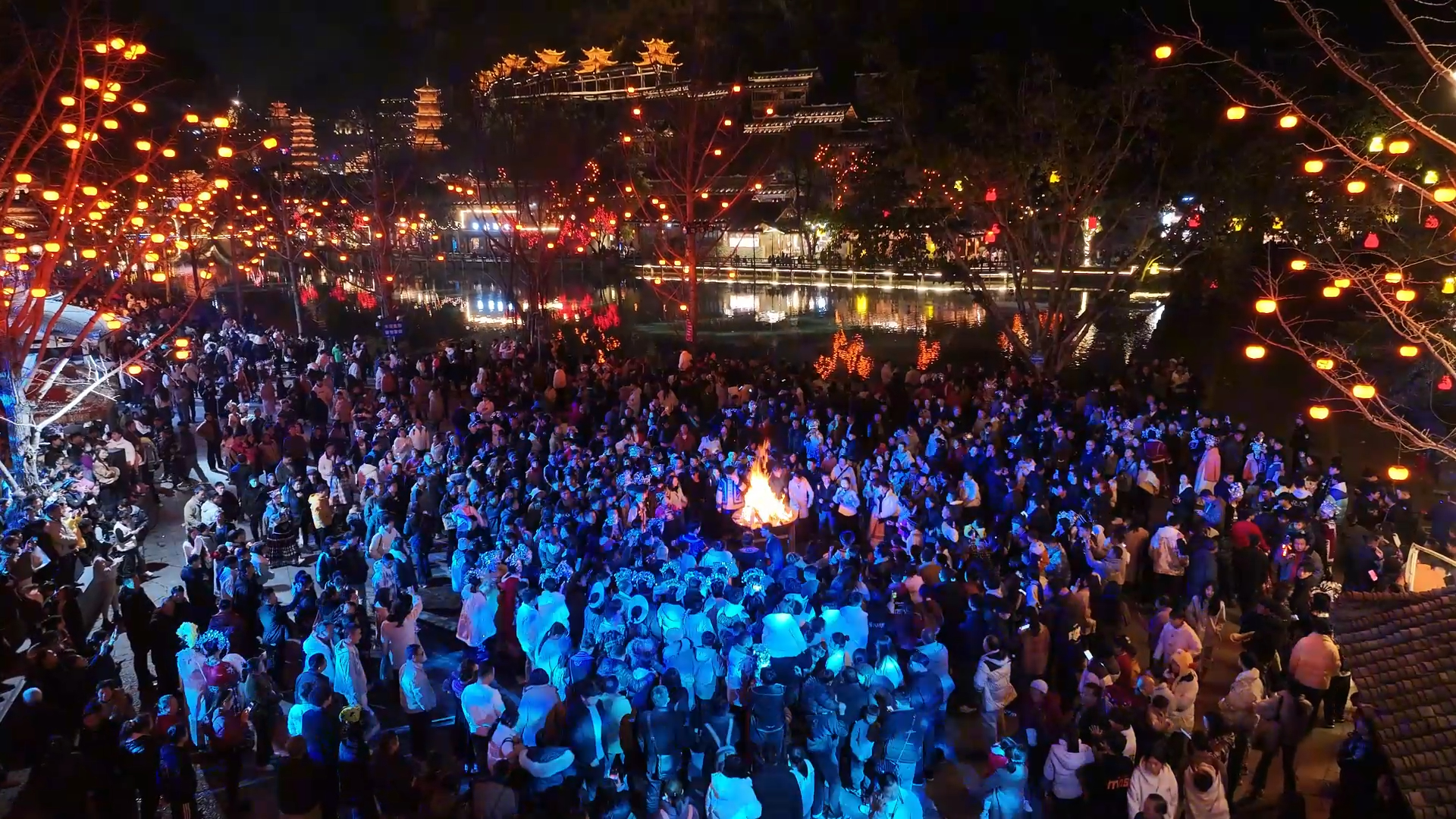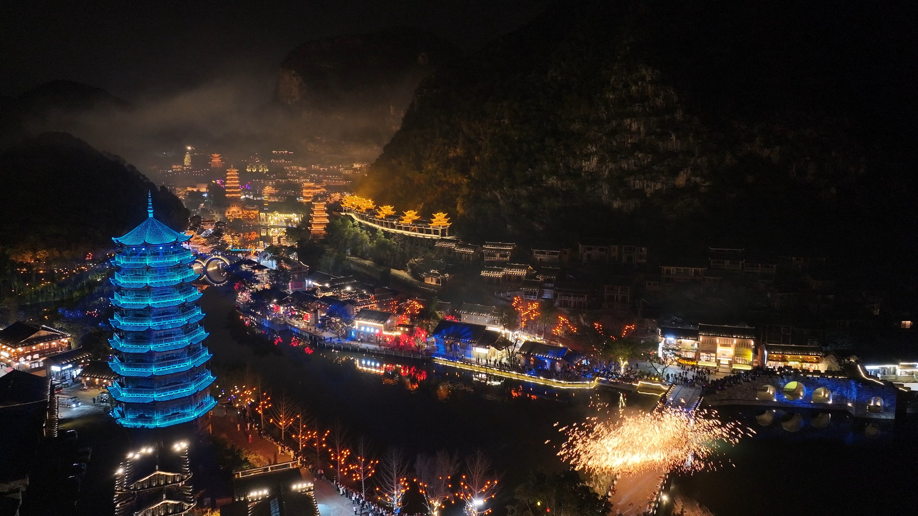 夜晚,绚烂的烟花、铁花在夜空中绽放,火壶如火龙飞舞,500架大型无人机盘旋天空摆出精美造型,传统文化融入现代科技更显惊艳。篝火燃起,全国各地的游客与布依族同胞手拉手,围着篝火跳布依转场舞,共享新春的快乐。