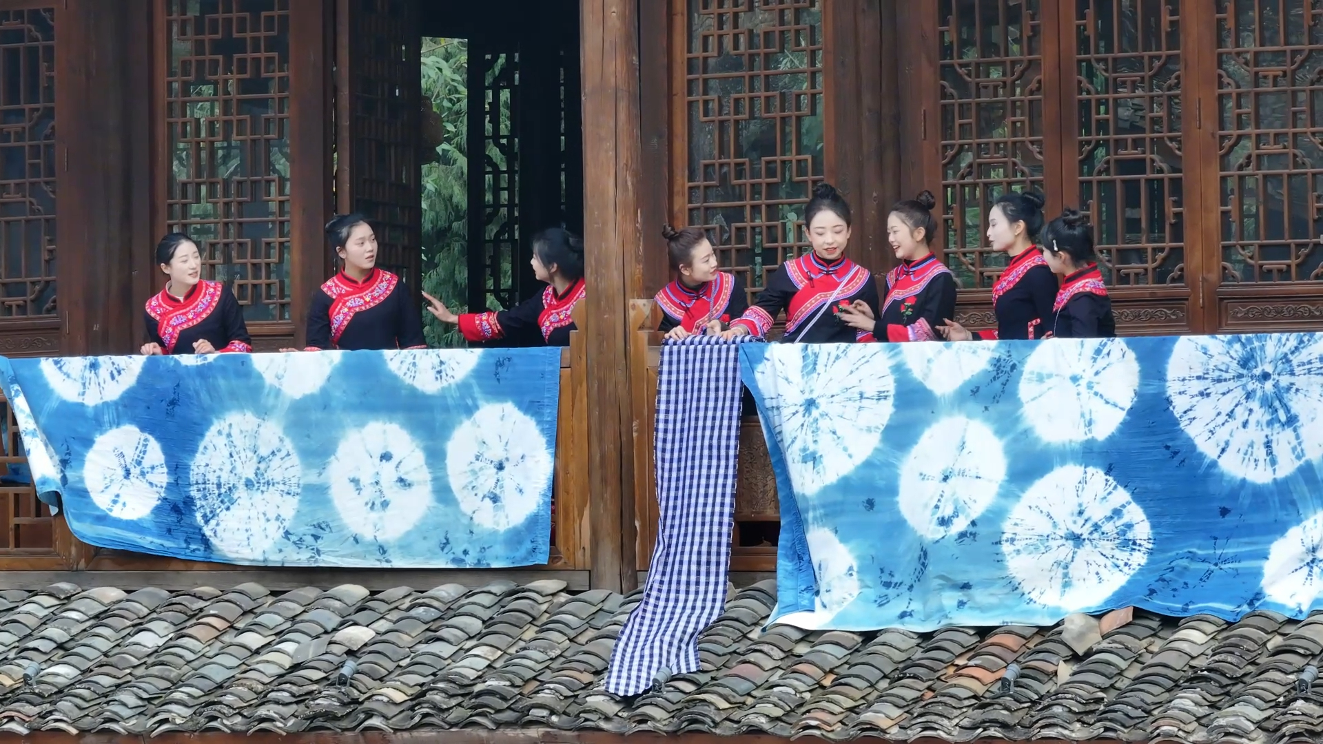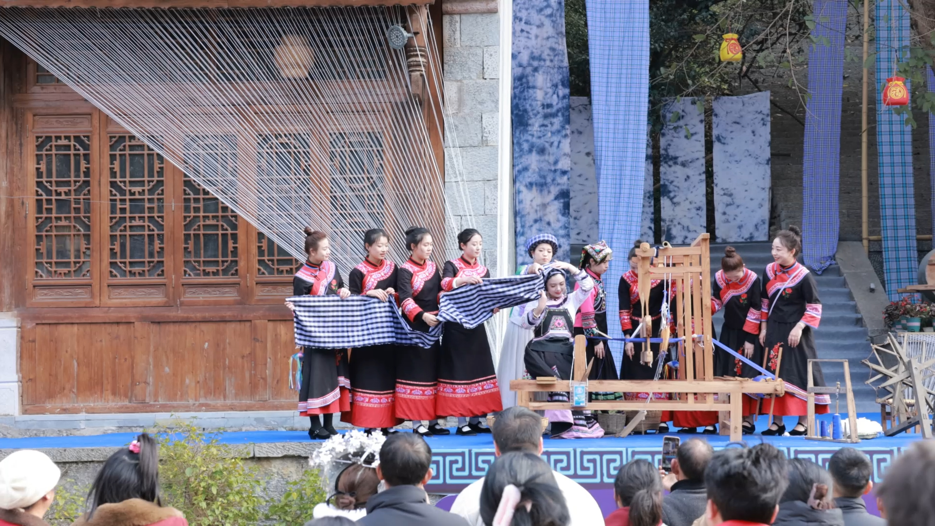 在布依族传统表演现场,布依族同胞跳起竹竿舞,游客们跟随音乐的节奏,纷纷加入其中。布依婚俗巡游过程中,身着盛装的布依族同胞簇拥着载有新娘的花轿,游客加入巡游队伍,一同体验接亲、长辈敬酒、贺喜糖等布依婚俗。