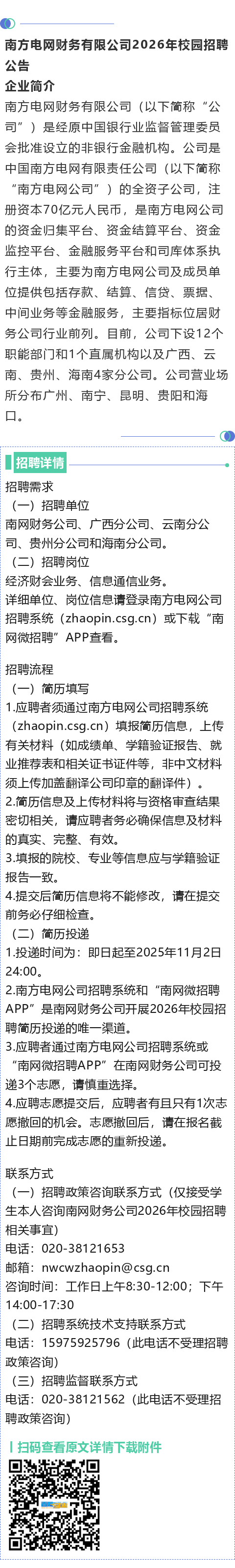 【国企】南方电网财务有限公司招聘!贵州有岗!报名截止时间:11月2日!