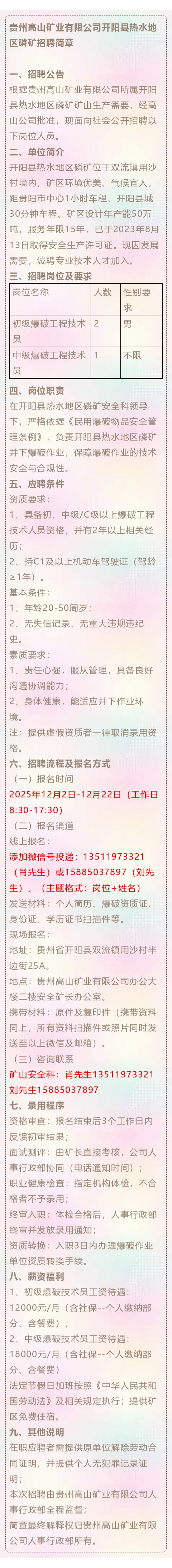 招聘初级/中级爆破工程技术员!月薪12000-18000元!提供免费住宿!