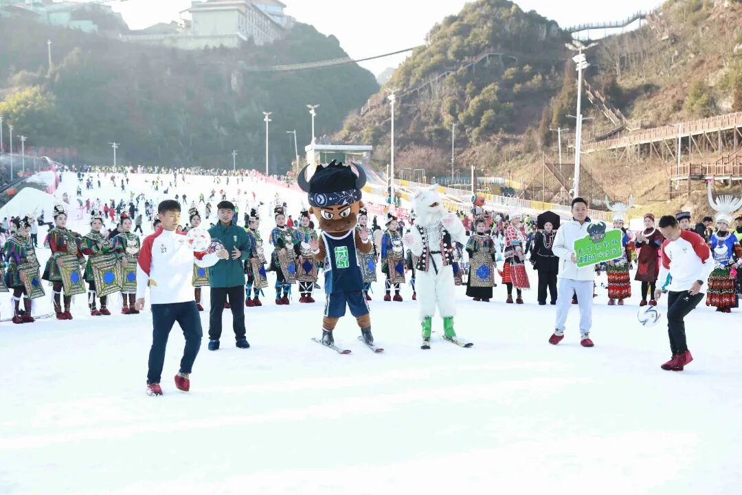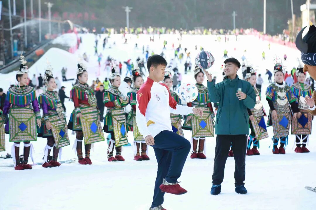 2月9日,来自黔东南州的“村超”“村BA”“村T”“村歌”“村羽”“村舞”等“村字号”表演队伍走进六盘水梅花山国际滑雪场,一亮相便成为全场焦点。游客们纷纷举起手机,在银装素裹的雪地中记录下黔东南“村字号”元素、少数民族风情与冰雪运动激情碰撞的精彩瞬间。