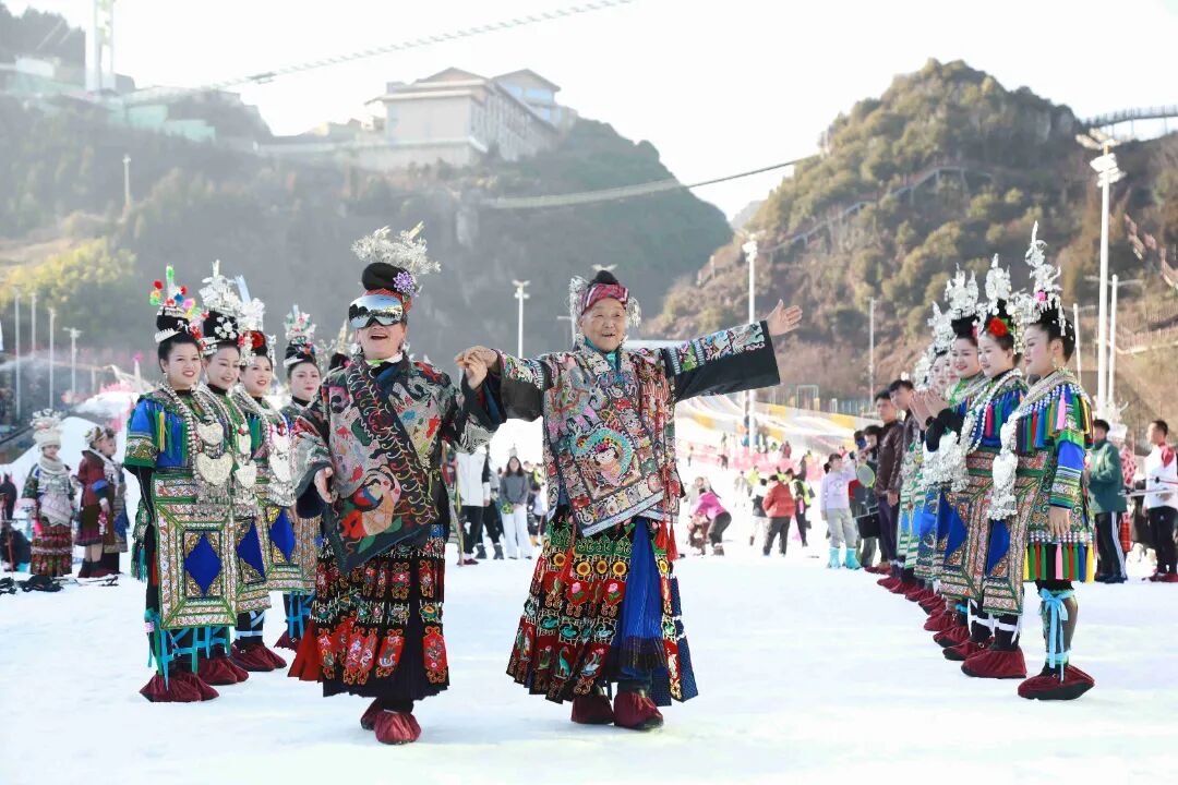 随后,百余名身着黔东南苗侗特色服饰的表演人员,以及“村字号”代表人物依次“登台”,将民族风情与冰雪运动活力完美结合,呈现出一场别开生面的民族服饰秀,动感身姿与冰雪赛道相映成趣,绘就一幅“民族风”与“冰雪梦”相融合的动人画卷,引来现场游客连连赞叹、拍照不停。