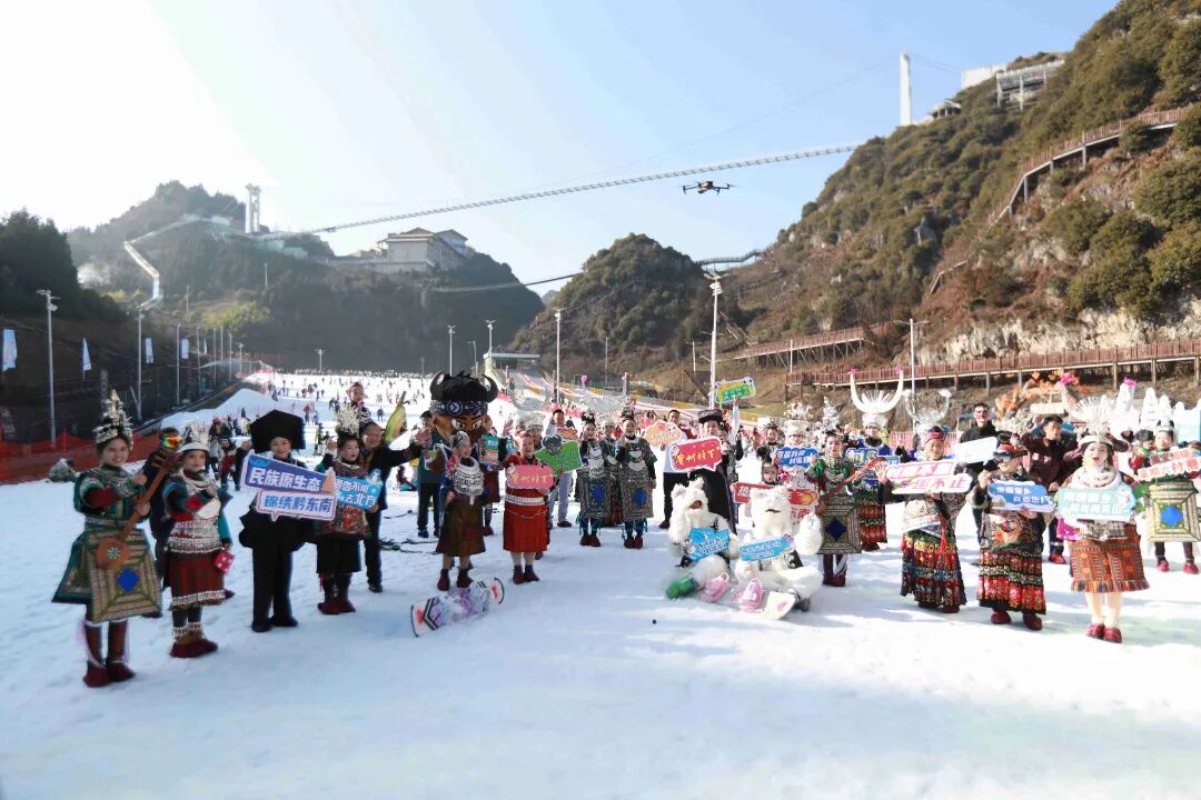 在场的游客兴奋地表示:“没想到在滑雪场上看到黔东南的元素,民族服饰与冰雪背景结合得这么美!”许多滑雪爱好者驻足拍照,记录这难得一见的场景。