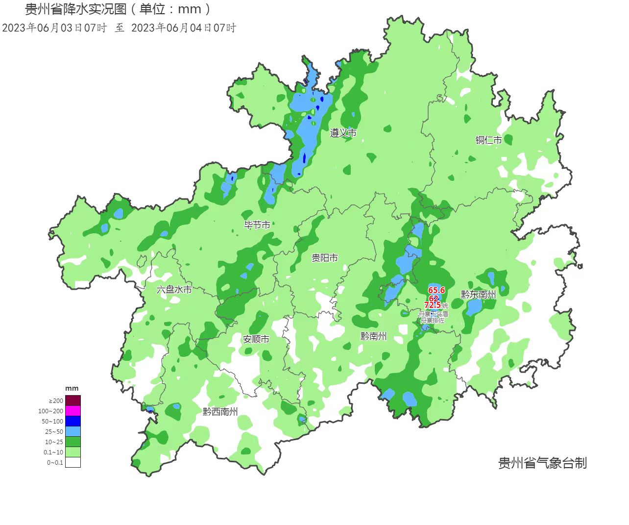 6月3日07时至4日07时,暴雨出现在兴义、桐梓、雷山、金沙、仁怀、七星关、丹寨、习水、麻江9县域内的29个观测站(乡镇最大为丹寨县排佐72.5毫米),大雨有135观测站。