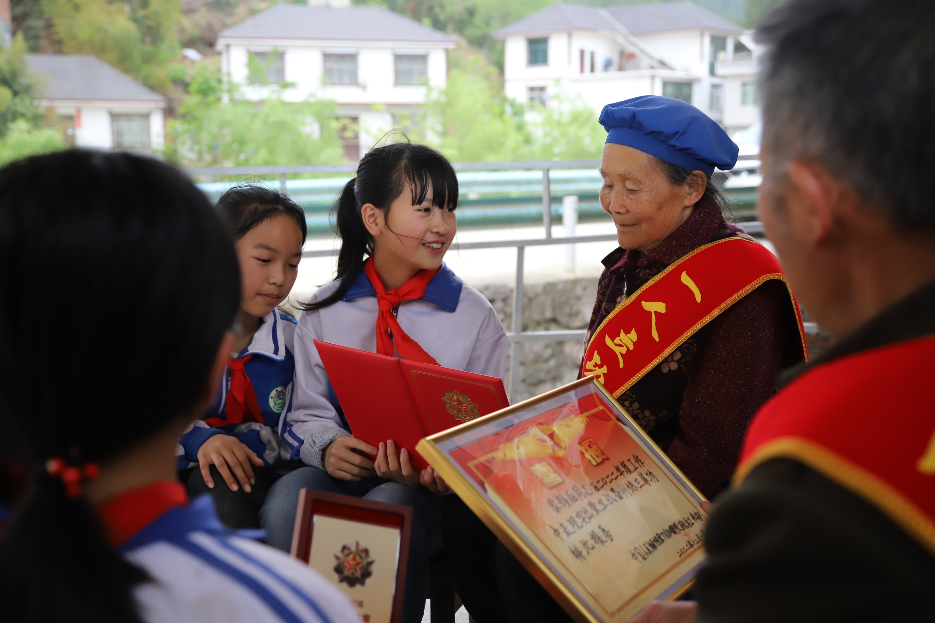 在荔波县甲良镇甲站村,来自甲站小学的四名学生代表参与送立功喜报活动。学生代表为家属送上喜报和军功章,并行少先队队礼,以表示对军人、军属的崇高敬意。