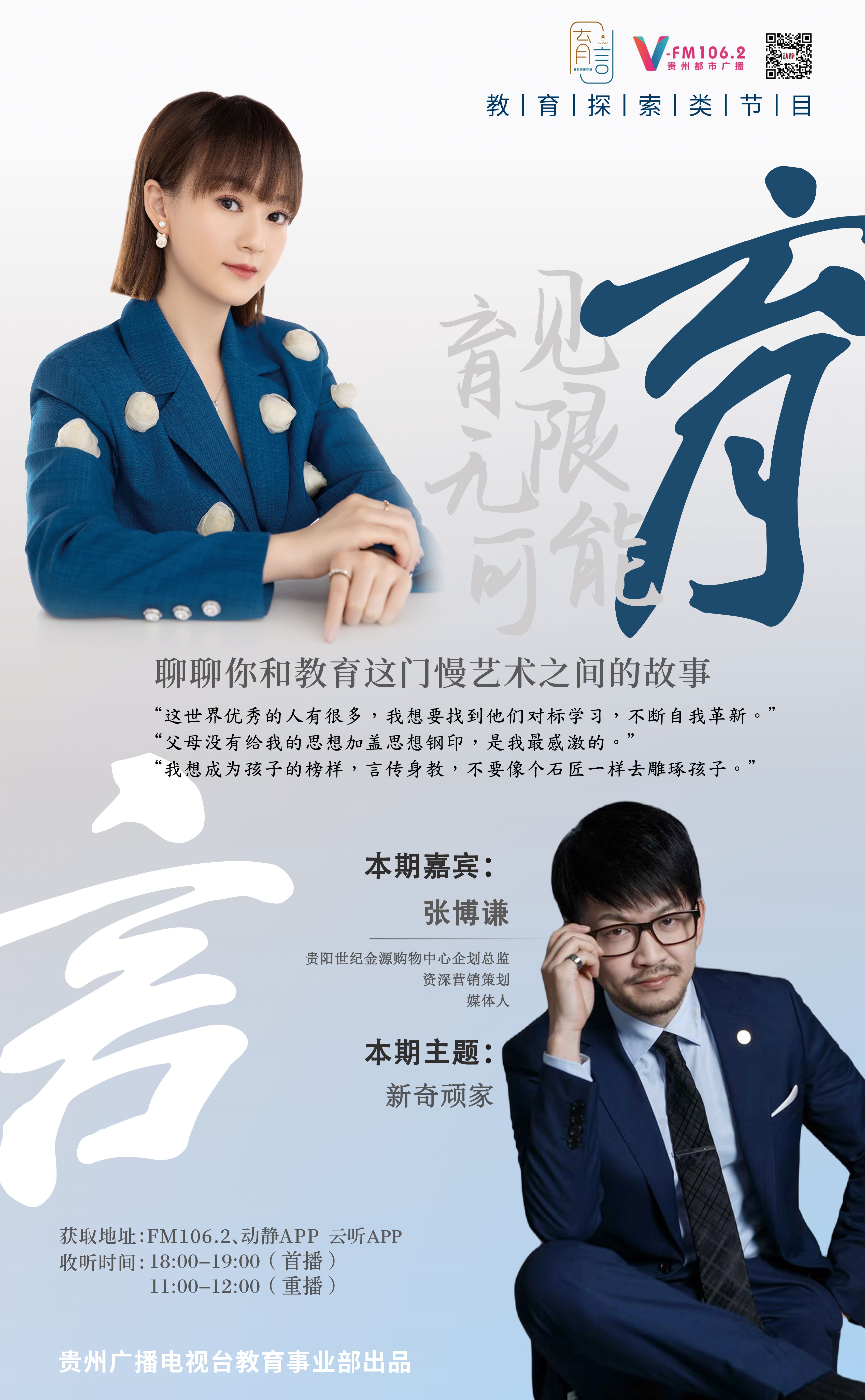 如同世界上没有两片相同的叶子,每个人的成长轨迹也不尽相同……我想倾听你和教育这门慢艺术之间的故事,欢迎在微信公众号“贵州都市广播”给我留言。教育探索类节目《育言》工作日18:00-19:00准时播出(随后第二个工作日11:00-12:00重播),期待与你一起育见无限可能!