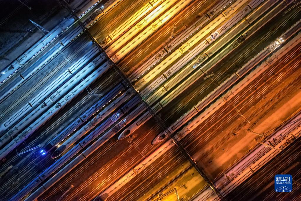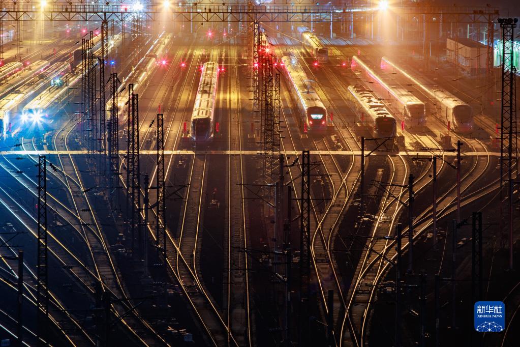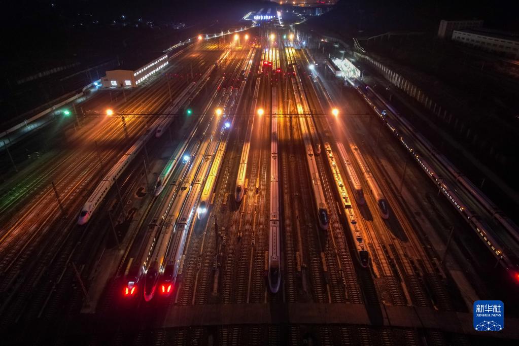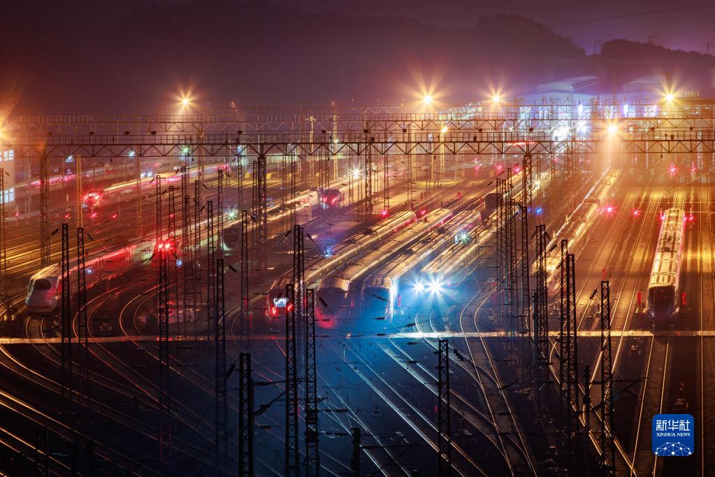 1月7日,2023年春运启动。1月6日晚,在中国铁路成都局集团有限公司贵阳北动车所,停靠在存车线上的动车排列整齐如同一支“陆地舰队”。新华社记者 刘续 摄