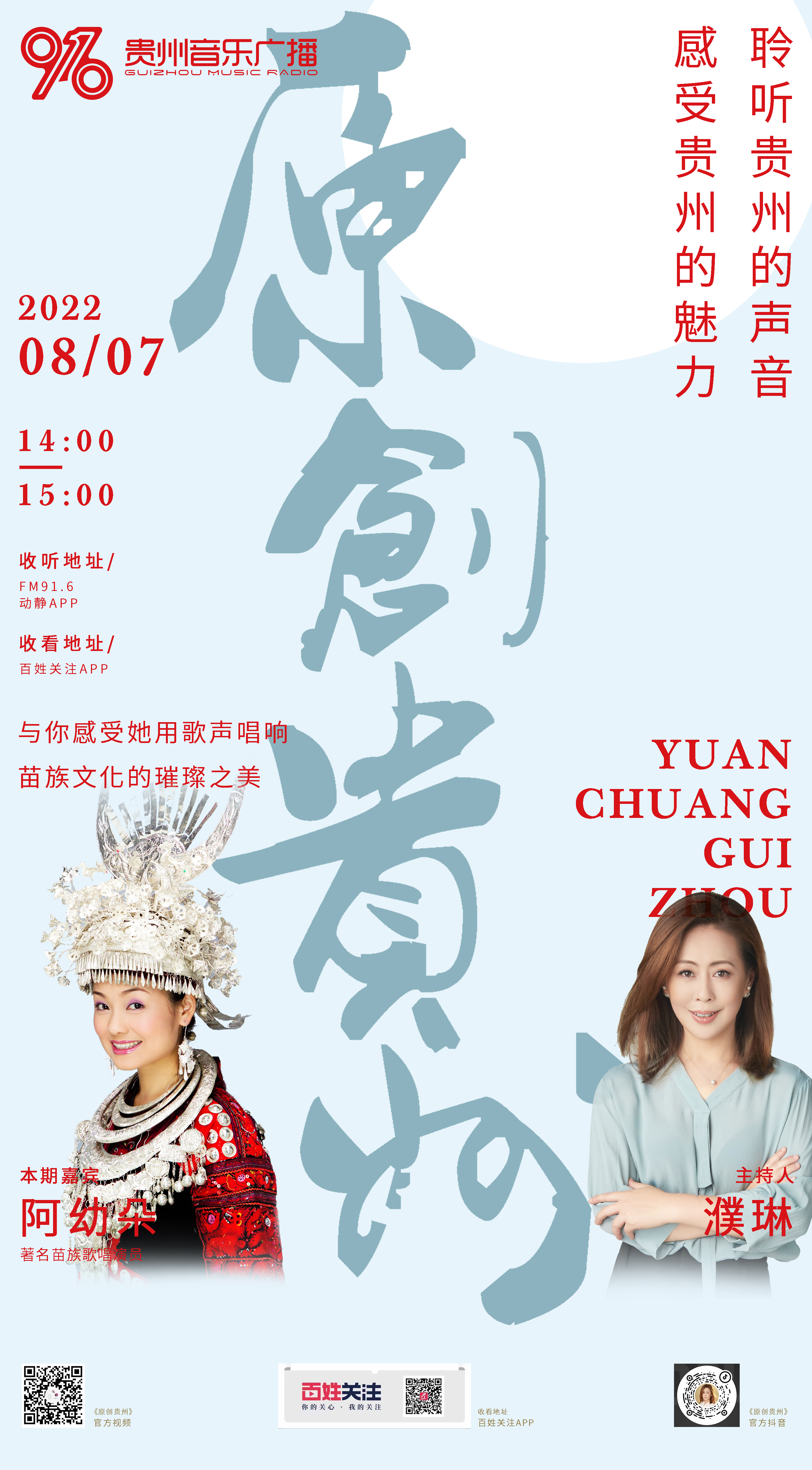 FM91.6贵州音乐广播8月7日14:00,著名苗族歌唱演员阿幼朵走进《原创贵州·对话》,与你感受她用歌声唱响苗族文化的璀璨之美。