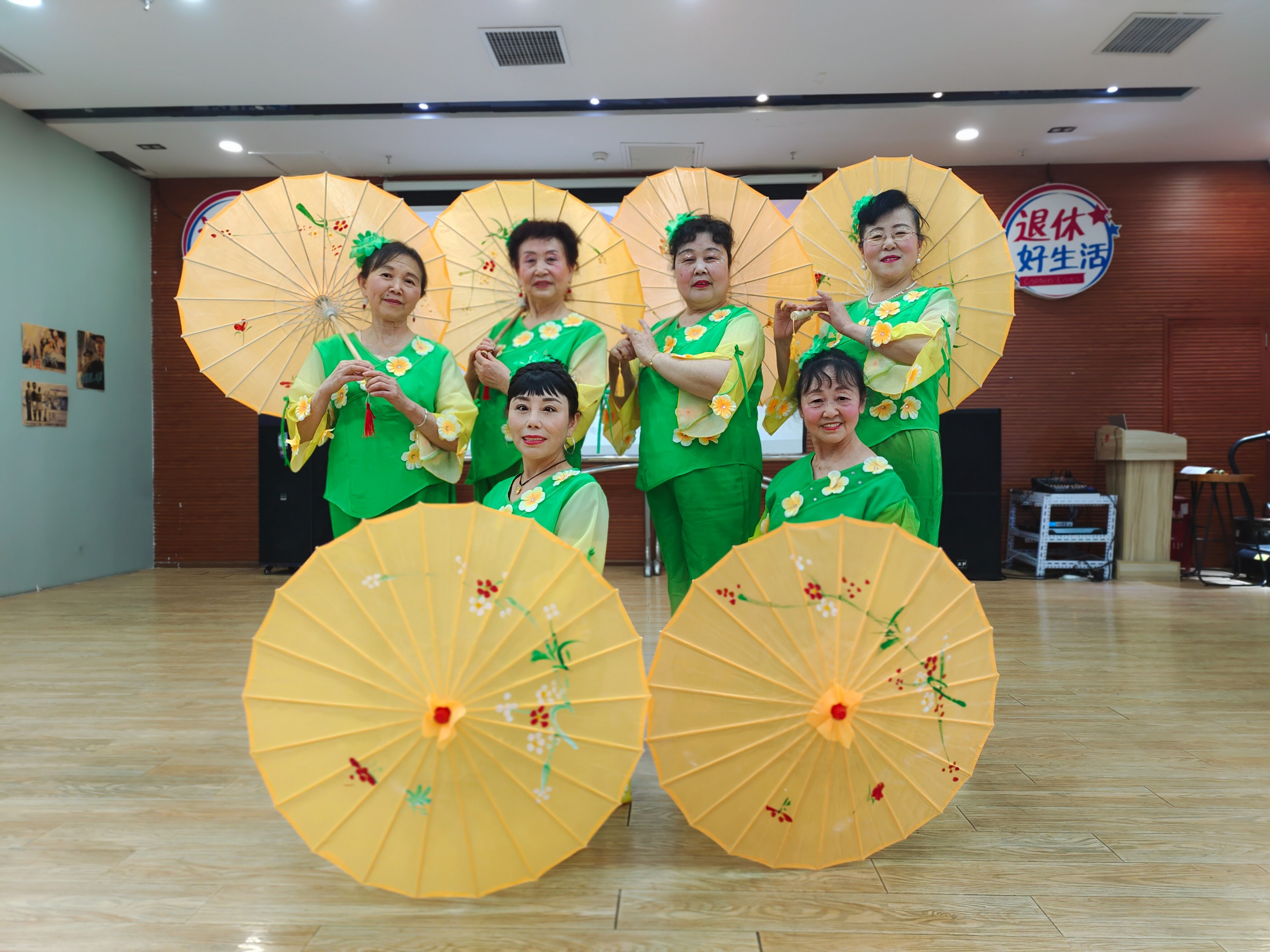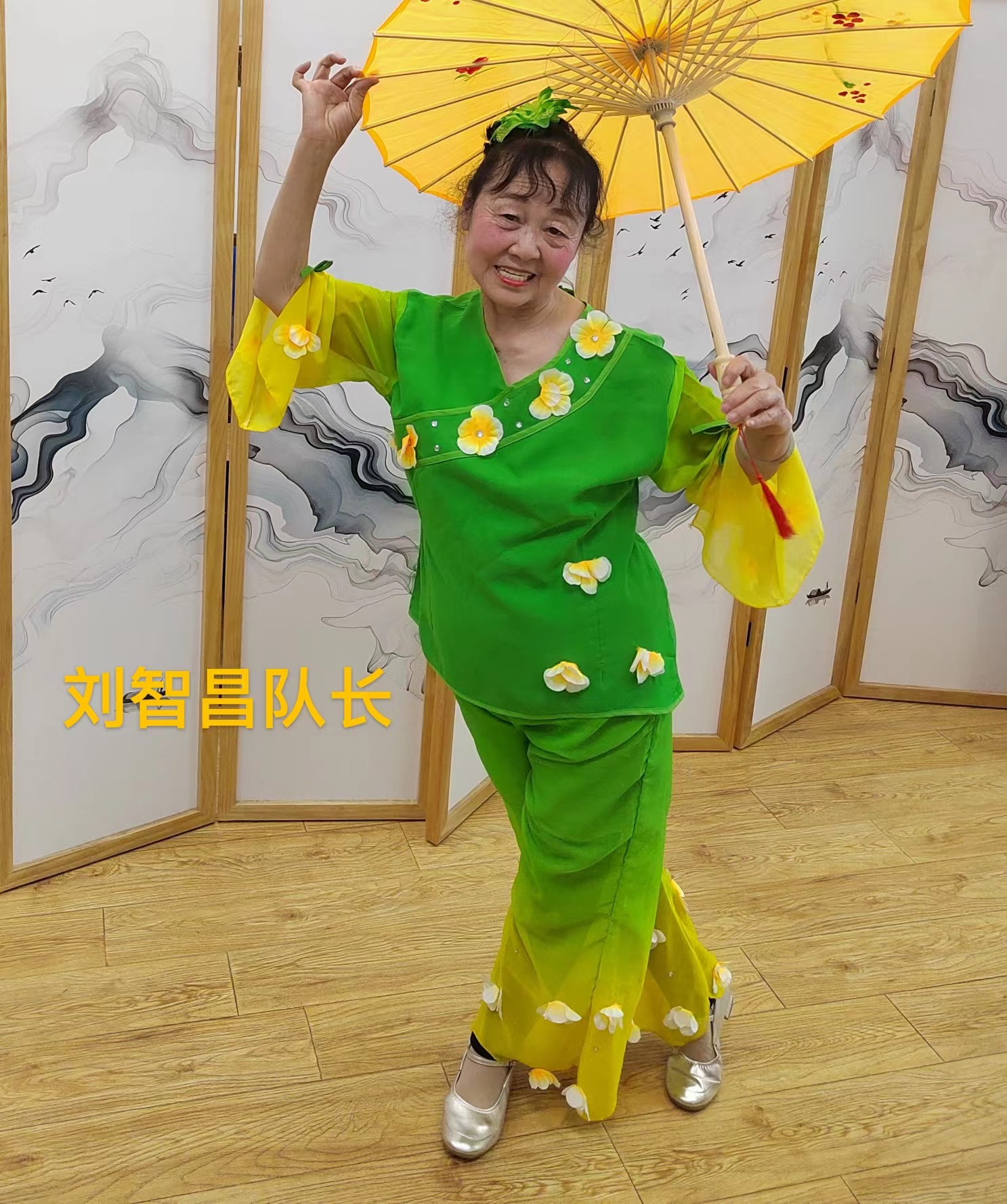 整体以黄色和绿色为基调衣服搭配上一把小纸伞,看起来十分清新。红扑扑的脸颊也让阿姨们看起来精神百倍,更多了一丝少女的可爱。