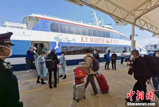 户籍设在金门地区的台湾民众及其配偶、子女等可提前登记预约乘船。图为台胞在厦门五通客运码头办理通关乘船手续。