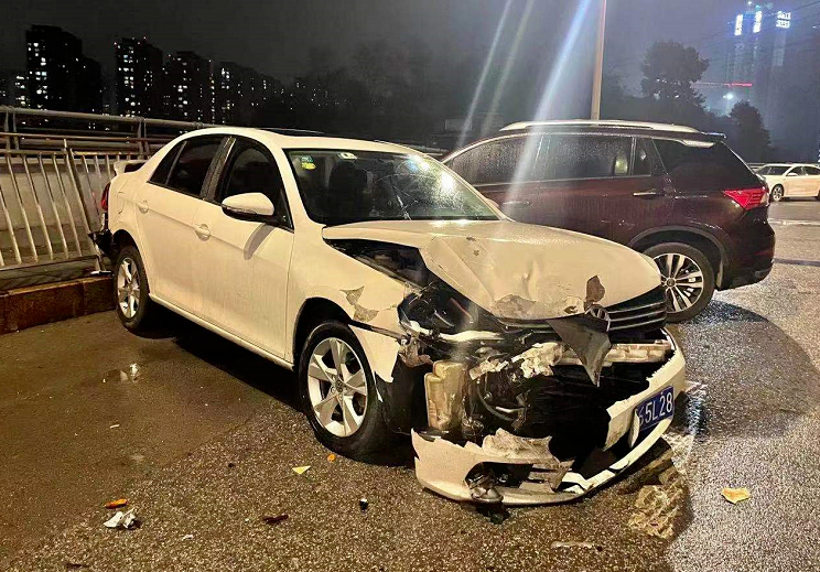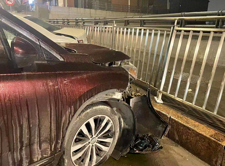 2021年12月31日晚上,记者在太金线隧道往花果园K区方向的出口处发现,一辆SUV和轿车发生了碰撞,事故造成SUV的车头受损严重,前保险杠大部分零件已经脱落,一旁的护栏也发生了变形。SUV驾驶员小叶告诉记者,他是第一次经过此隧道,并不知道前方有个急转弯,在驶出隧道后由于雨天路滑,没有控制好方向盘才撞上了停靠在前面的轿车的车尾。