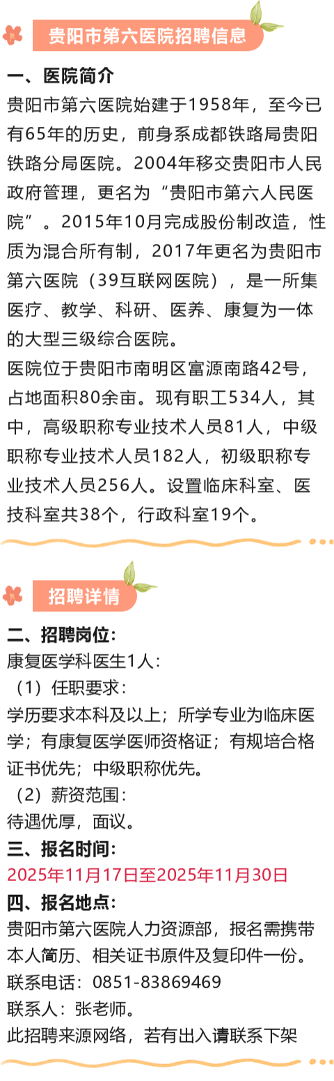 贵阳市第六医院招聘!报名截止时间:11月30日!