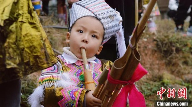 一位苗族小男孩在吹芦笙。潘友婷 摄