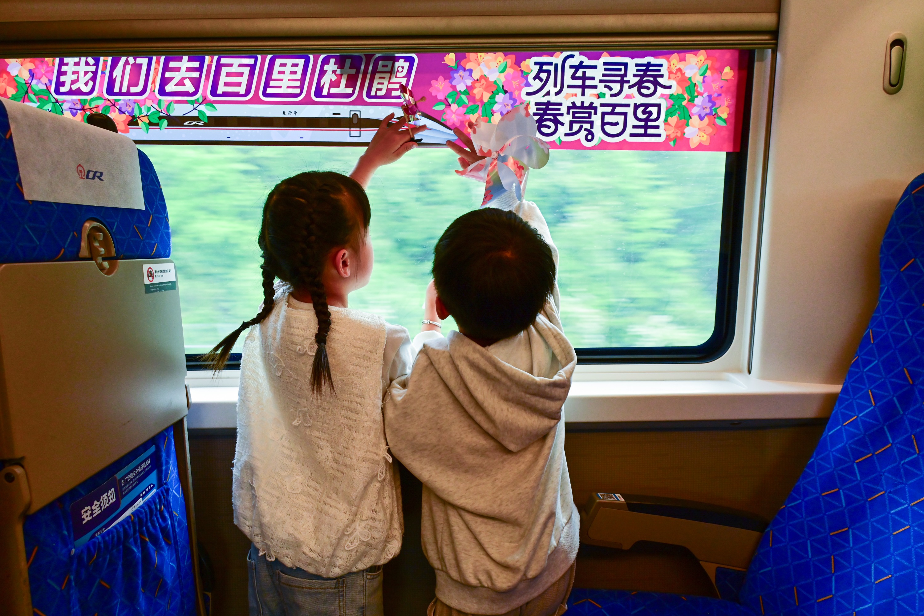 “欢迎踏上这趟寻春之旅。”9时50分,列车长张晓凤的声音在4号车厢响起。“这个周末阳光正好,如果去毕节可以看看百里杜鹃。现在山间春意正盛,更适合到处走走。”她介绍了今年百里杜鹃花期的情况,也将旅途目的引导向广义的赏春。