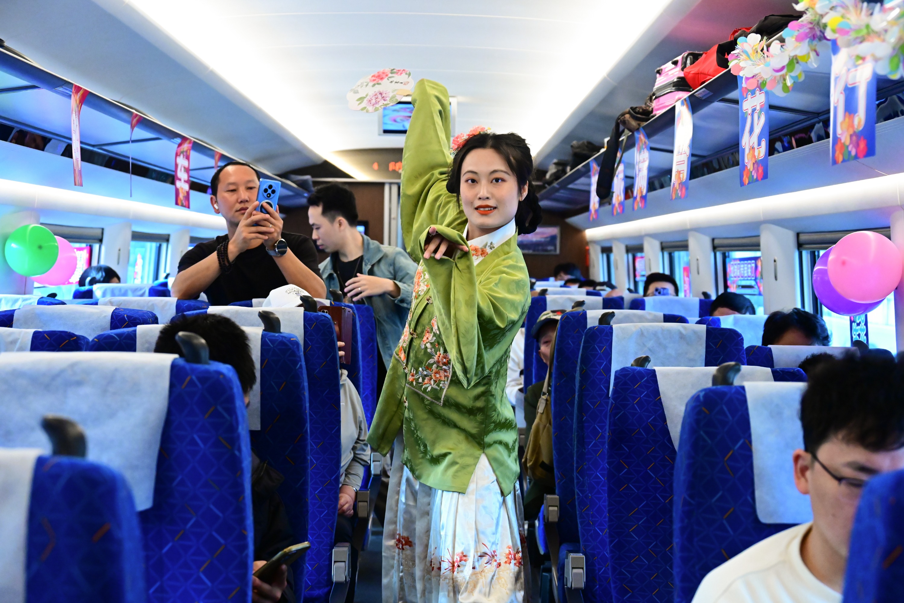 话音刚落,音乐清扬。身着汉服盛装的姑娘翩然起舞,饰物跟着节奏摇动,裙摆伴随动作展开,在场旅客纷纷投去赞赏的目光,车厢内瞬间点燃一片欢腾。
