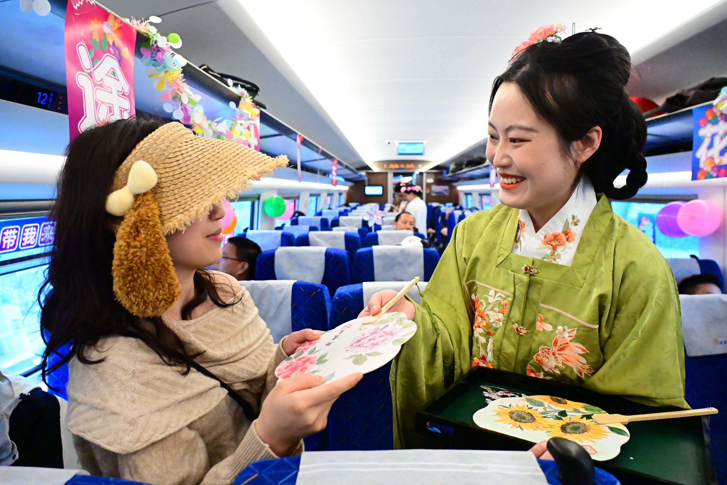 诗词环节则让热闹沉淀下来。“繁枝容易纷纷落,嫩叶商量细细开。”乘务员徐杨朗诵着诗句,和窗外的山川河流相映成趣。诗词里的春天和车窗外的风景在这一刻同框,也让乘车旅客纷纷举起手机按下快门留下难忘瞬间。