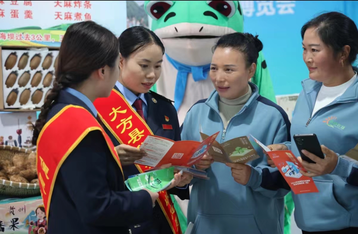 图为大方县税务局干部为参加博览会的商家宣传税收政策。漆毓摄