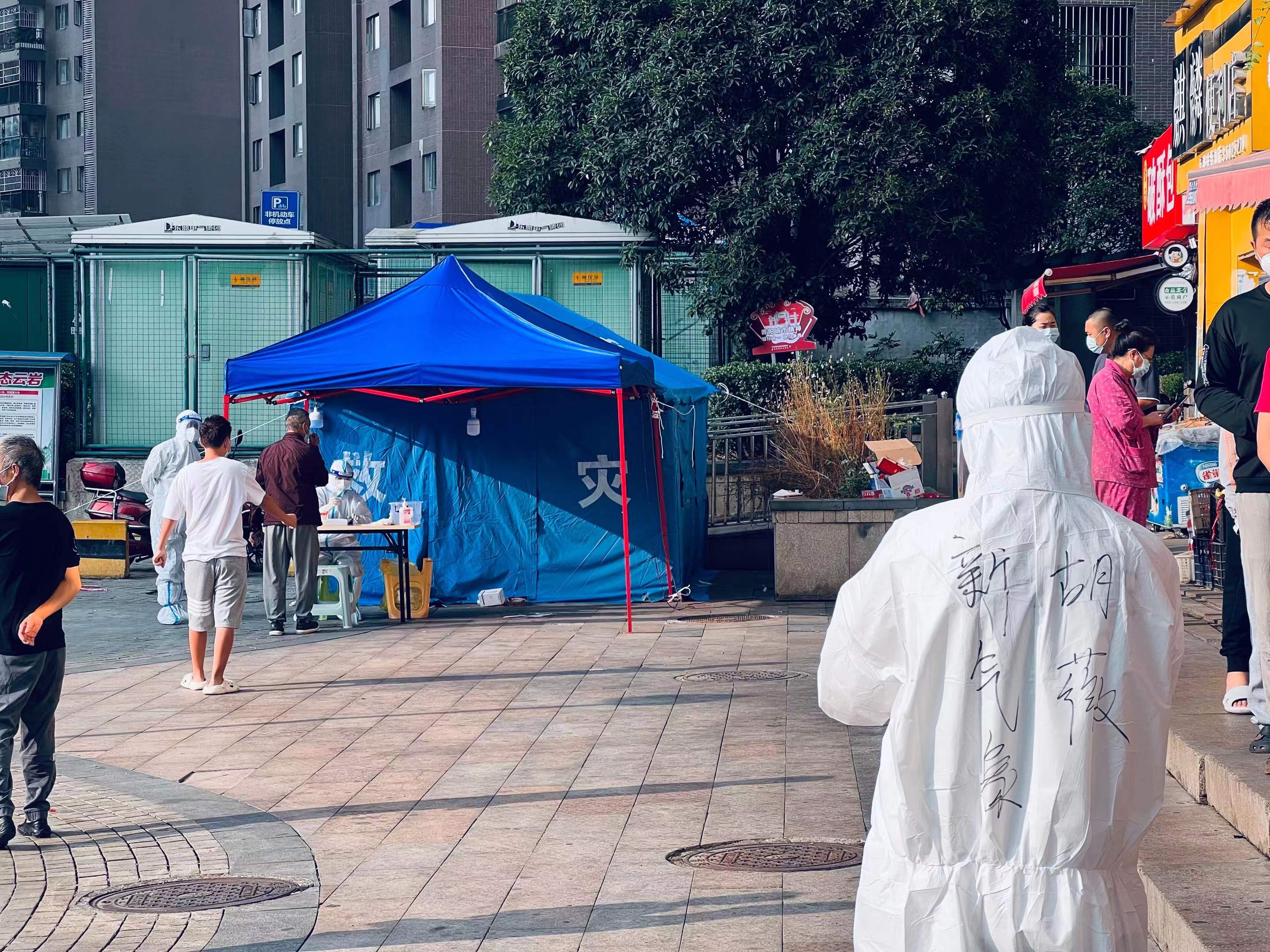 我们这一队共有12人,成了四个小分队,我归属的分队主要负责渔安新城B7、B8栋辖区居民的抗原检测和分发中秋节物资等工作。一开始我想着只有两栋,我们分头行事一会儿就能完成,但我们都“轻敌”了,渔安新城的住户密集,每栋都有35层楼,每一层楼有8户,一共有280户,共计1200余人。一起做志愿服务的芳草地国际学校的王思雨老师总开玩笑说:“如果我们这里每栋只有15层楼,那我们每天都可以服务5栋楼,我们是不是很厉害。”对于思雨的“显摆”,虽然没人“搭腔”,但大家都有一份埋在心底的自豪感。我们每天与时间赛跑,在最短的时间里完成任务,为560多户居民送去服务,我们是自豪的。
