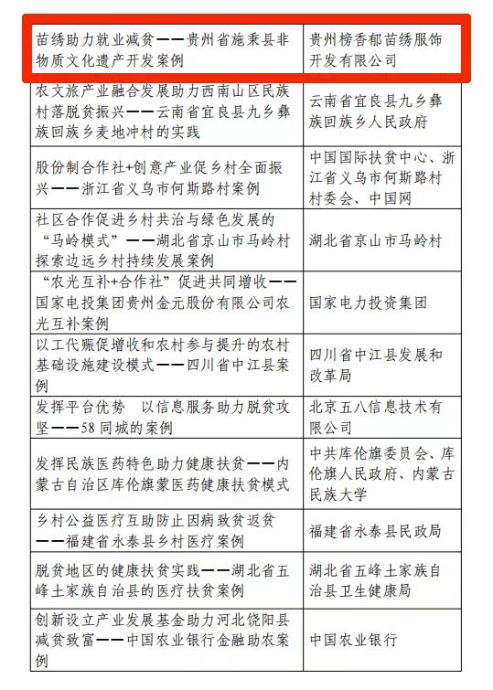 “全球减贫案例征集活动”面向全球关心扶贫的组织和个人征集原创优秀减贫案例,旨在以案例为载体,推广分享各国减贫成功实践。贵州入选的《苗绣助力就业减贫——贵州省施秉县非物质文化遗产开发案例》在非遗助力乡村振兴、非遗工坊建设、非遗保护工作等方面,都颇具引领性、示范性,并且特色独具,具有广泛的推广价值,以及可供复制、借鉴、参考作用。