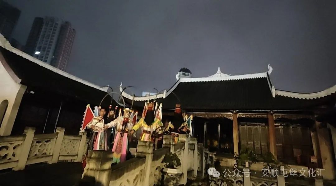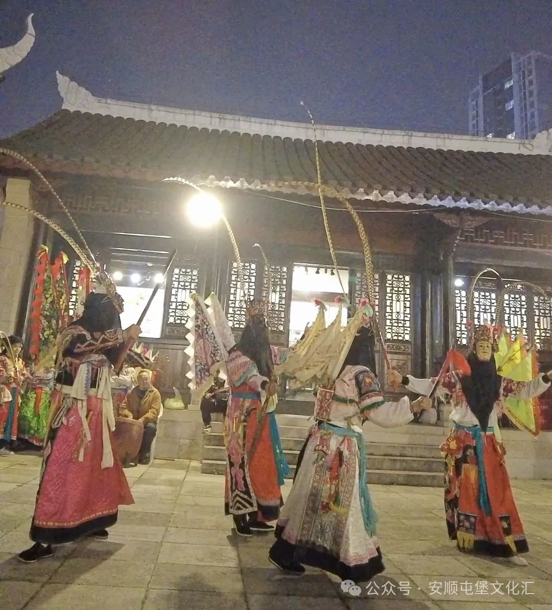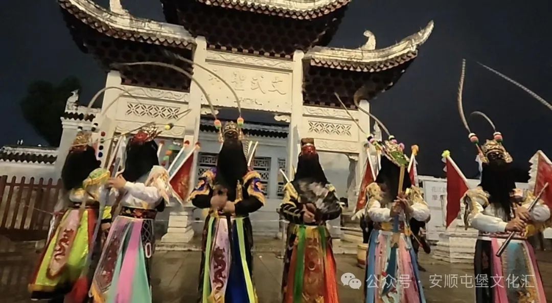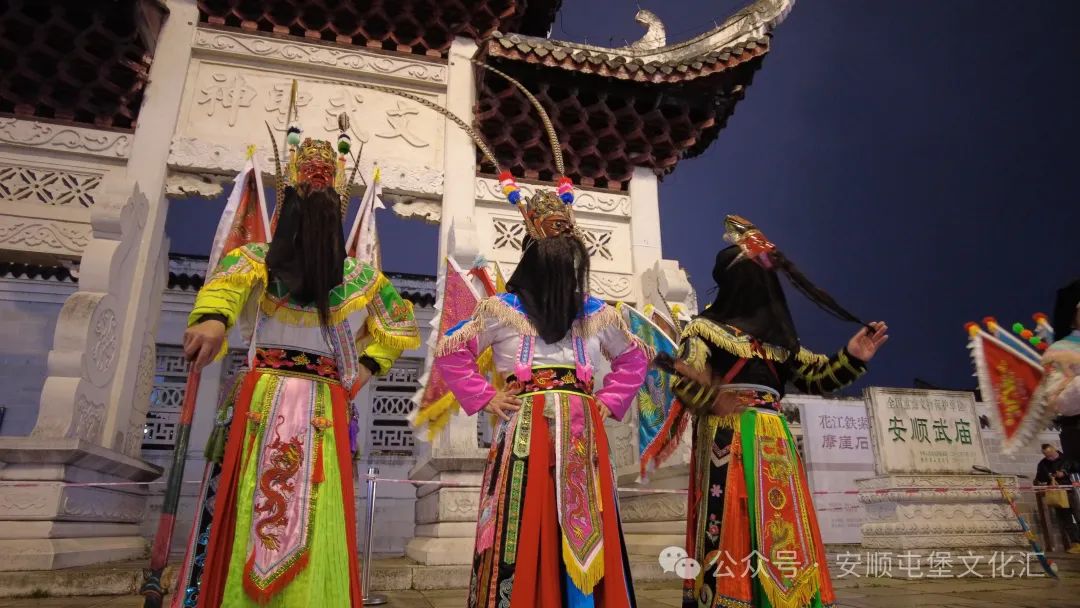 而安顺武庙,更是为屯堡地戏增添了一抹庄重肃穆与神圣庄严之感。武庙内,朱墙黛瓦、雕梁画栋,飞檐斗拱巍峨耸立,在阳光的倾洒下尽显庄严肃穆。当屯堡地戏的精彩表演在此呈现,古老的建筑仿佛瞬间被注入蓬勃的生机与活力。演员们于武庙的庭院中尽情舞动,与周边的建筑环境相映成趣、相得益彰。武神的塑像威严庄重地凝视着这场文化盛宴,仿若在默默守护着这一珍贵的文化传承。置身于武庙的氛围之中,屯堡地戏的每一个情节都愈发扣人心弦、引人入胜。英雄人物的飒爽登场,在武庙建筑的映衬下,尽显豪迈无畏的气概;战斗场景的激情演绎,激烈的动作与庄重的庙宇环境相互交融,不禁令人对先辈们保家卫国的英勇精神肃然起敬,心潮澎湃。