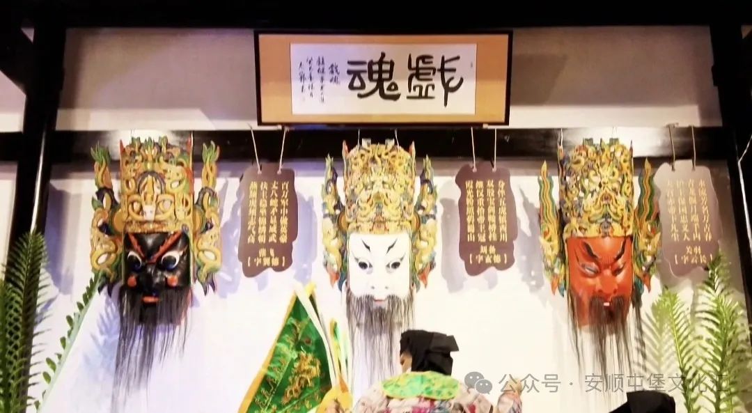 步入安顺武庙屯堡地戏展示厅,浓郁的非物质文化遗产气息扑面而来。四周挂满了形态各异的英雄人物面具,或威武、或勇猛、或坚毅,每一张都承载着厚重的历史与传说。正中间“战魂”牌匾高悬,似在诉说着往昔金戈铁马的岁月,让人不禁对这古老而神秘的屯堡地戏艺术心生敬畏与向往。