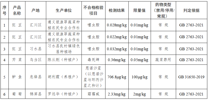 一、汇川区遵义银渔翠蔬菜种植农民专业合作社生产的2批次豇豆,经检测发现噻虫胺不符合食品安全国家标准规定。