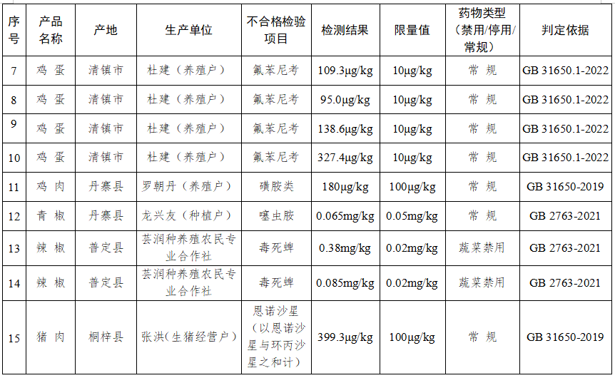 六、清镇市杜建养殖户生产的4批次鸡蛋,经检测发现氟苯尼考不符合食品安全国家标准规定。