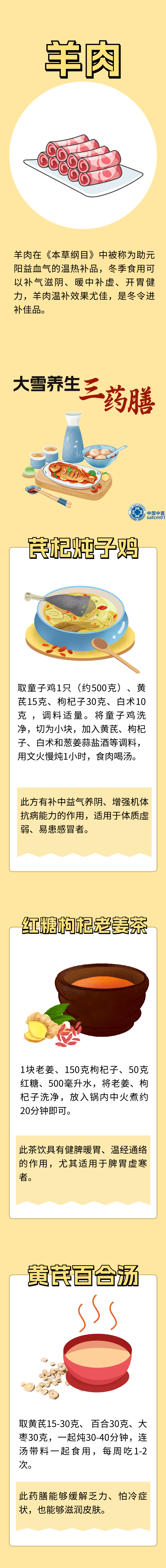 俗话说,“大雪吃五宝,快活人不老”,进入大雪节气之后,我们可以通过调饮食来达到强身健体的目的。小编今天给大家整理了五种食物、三款药膳,赶紧吃起来吧!