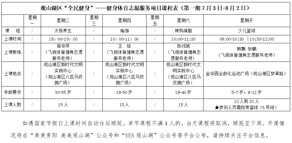 4.本次报名仅为第一期公益培训,每期课程将提前一周在“爽爽贵阳 美美观山湖”公众号、观山湖区各新时代文明实践所、观山湖区新时代文明实践中心云平台等平台公布。