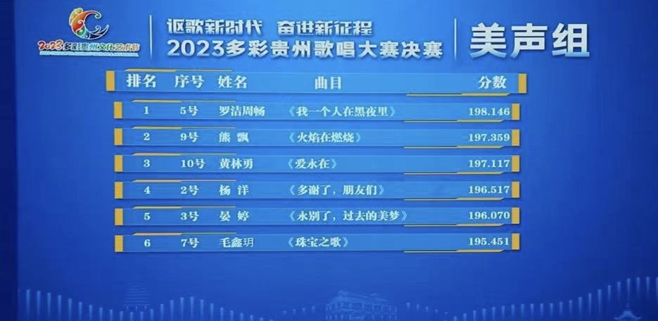 作为2023多彩贵州文化艺术节主体活动之一,2023多彩贵州歌唱大赛以“讴歌新时代奋进新征程”为主题,通过歌唱的艺术形式、群众的广泛参与,充分展现多彩的民族特色文化,艺术呈现新时代贵州形象。贵州音乐家协会会员,现任贵州民族大学音乐舞蹈学院声乐教师及硕士研究生艺术指导罗洁周畅一路过关斩将,最终成为2023多彩贵州歌唱大赛美声组冠军。