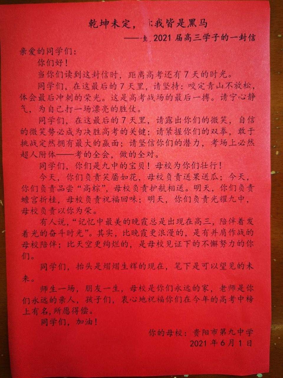 2021年6月1日,一封“贵阳九中给学生”的一封信也来到了邓生艳的高三(6)班,除了满满激励的话语,还有人手一个的桃子和粽子。这也是一种祝福吧,愿桃李满天下、愿所有考生都能一举高中。
