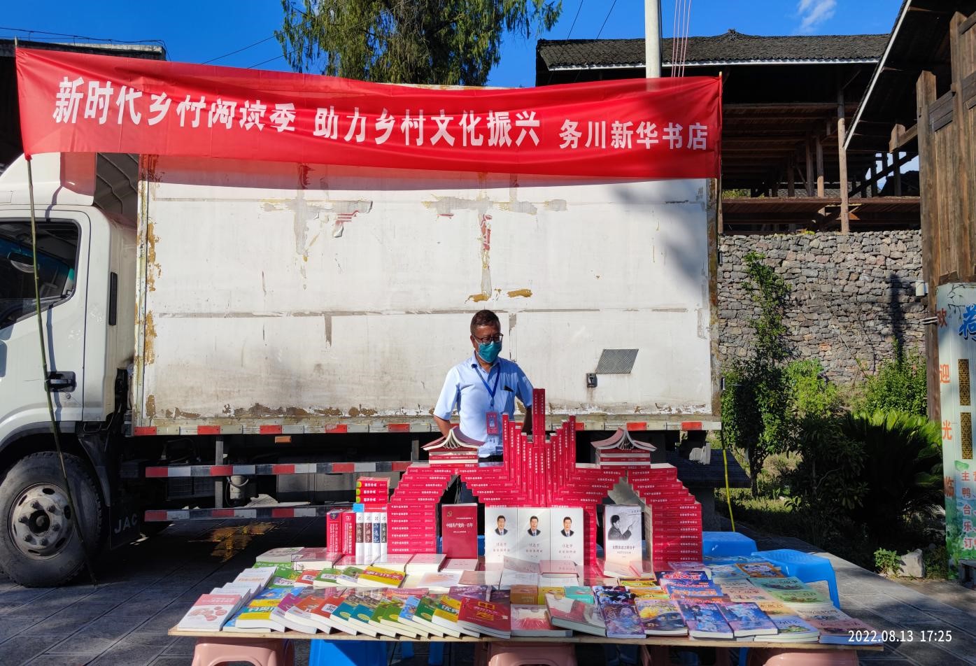 为强化思想政治引领,着力推进乡村阅读进程,推动习近平新时代中国特色社会主义思想深入农村、深入基层、深入群众,2022年8月13日,遵义市新华书店有限公司务川县分公司结合“强国复兴有我”群众性主题宣教活动,深入务川县大坪镇开展“阅读进乡村”活动,向当地村民提供流动阅读服务。
