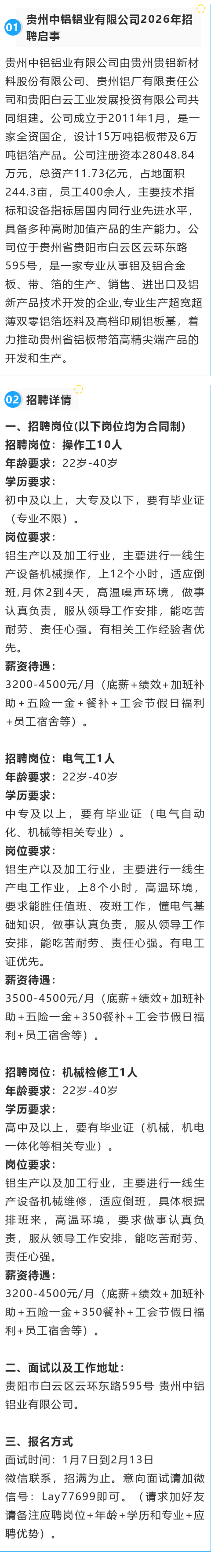 【国企】贵州中铝铝业有限公司招聘!初中起报!