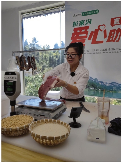 黑猪养得好,也要卖得好。彭家沟村主动拥抱互联网,在返乡青年杨情等人的带领下,通过爱心助农直播间,将黑猪肉、白柚等“土特产”销往全国各地,甚至远销新加坡。截至目前,直播间稳定为15名村民提供就近就业岗位,帮助村民销售黑猪5000余头,累计实现销售收入4500余万元。