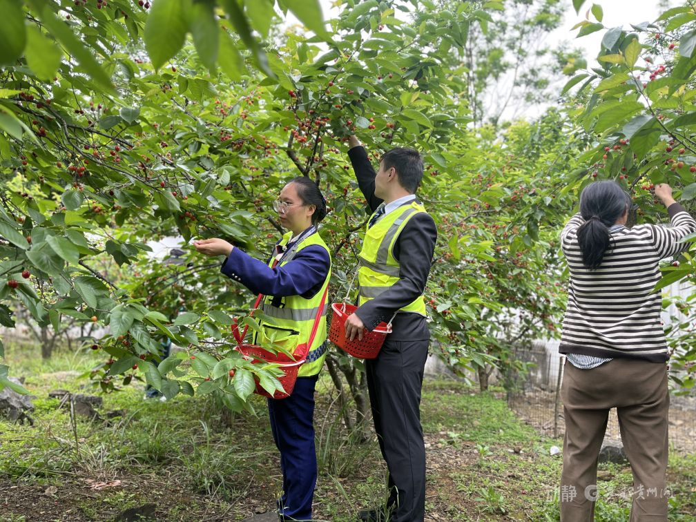 暮春四月,毕节市纳雍县厍东关乡总溪河畔六万亩玛瑙红樱桃迎来采收旺季。在厍东关收费站周边,农户们穿梭林间抢抓采摘,现场一派丰收繁忙景象。贵州高速集团毕节营运中心第四片区中心党员干部、青年深入樱桃林间,与当地农户一同采摘分拣、搬运鲜果,全力抢抓农时,助力樱桃采收上市。