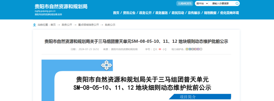7月23日,贵阳市自然资源和规划局发布关于三马组团普天单元SM-08-05-10、11、12地块细则动态维护批前公示。