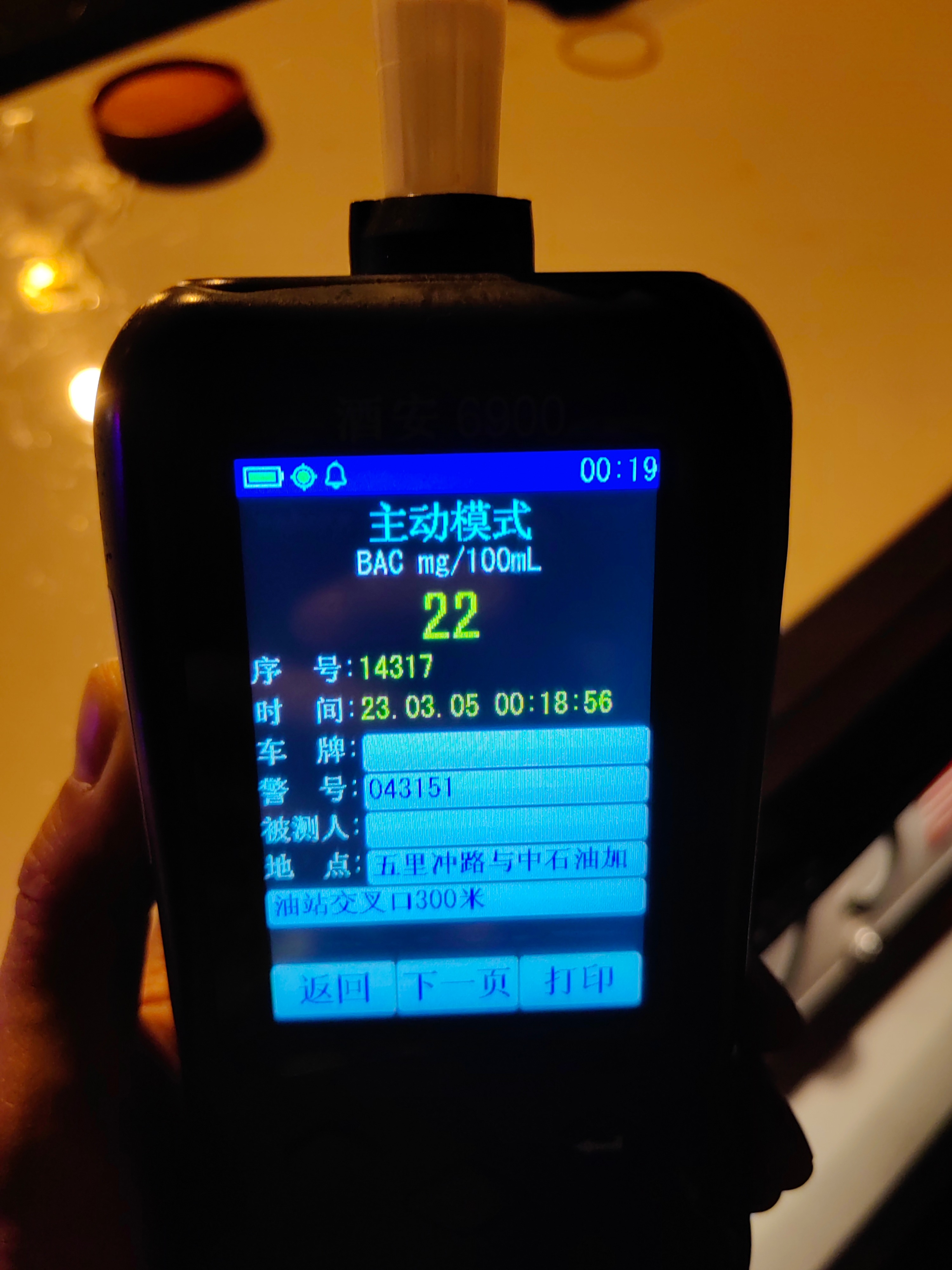当天0时许,一辆白色轿车驶入卡点,民警通过呼气式酒精检测,检测结果为22mg/100mL,确定为饮酒后驾驶机动车的违法行为,驾驶人对检查结果无异议。