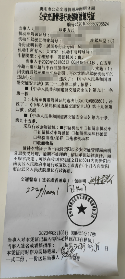本次吴某宏饮酒后驾驶机动车的行为再次被查,属于因饮酒后驾驶机动车被处罚,再次饮酒后驾驶机动车的违法行为。根据《中华人民共和国道路交通安全法》的规定,吴某宏由于驾驶证在吊销期间仍驾驶机动车的违法行为,和因饮酒后驾驶机动车被处罚,再次饮酒后驾驶机动车的违法行为。民警给吴某宏开具道路交通管理行政强制措施凭证,扣留其机动车,并通知吴某宏按期到贵阳市公安交通管理局南明区分局接受处理。