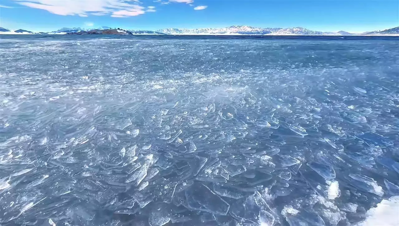 新疆赛里木湖“落日冰推”美到犯规,网友称酷似巨龙的鳞片,景区工作人员:冰花、冰泡泡也很好看