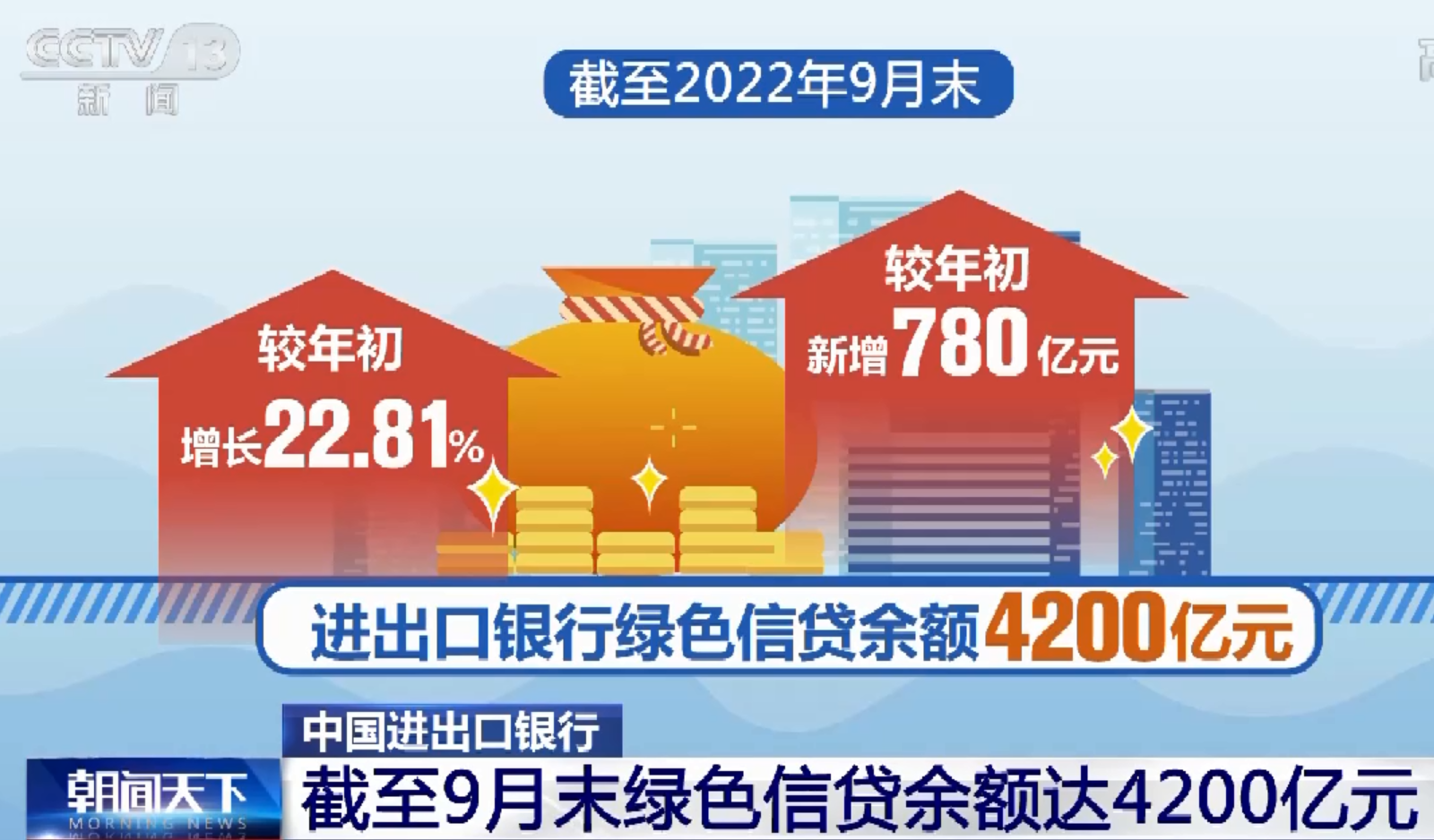 ▲截至2022年9月末,中国进出口银行绿色信贷余额4200亿元,较年初新增780亿元,较年初增长22.81%。作为政策性金融机构,中国进出口银行持续提升金融服务能力,逐步形成绿色金融服务体系,全力支持绿色发展。