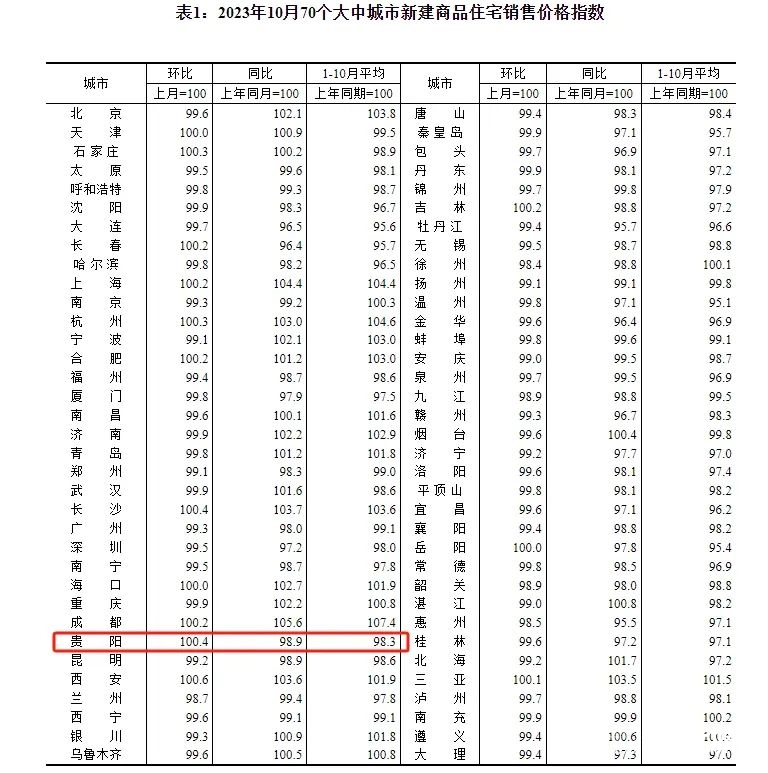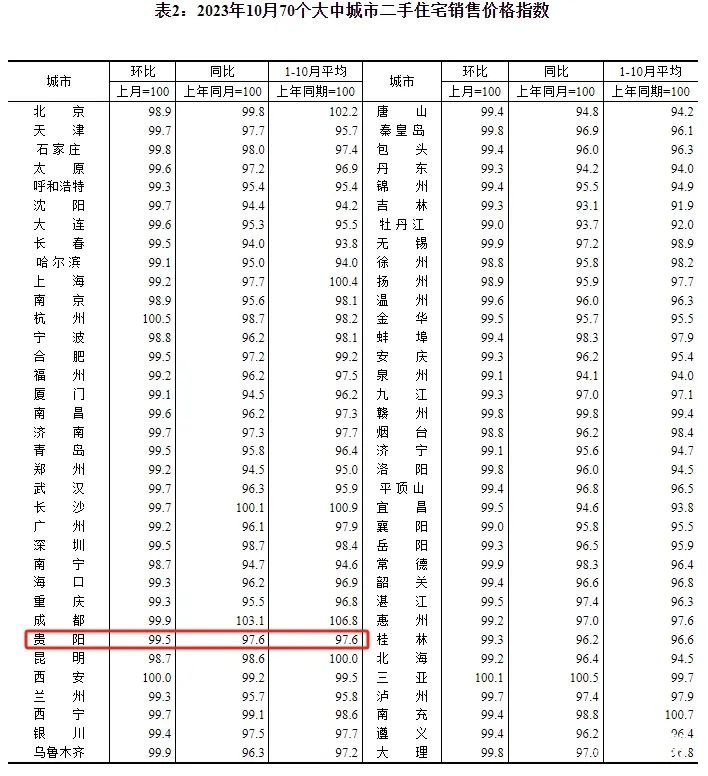 国家统计局11月16日发布2023年10月份70个大中城市商品住宅销售价格变动情况。数据显示,贵阳市10月新建商品住宅销售价格环比上涨0.4%,同比下降1.1%;二手房住宅销售价格环比下降0.5%,同比下降2.4%。