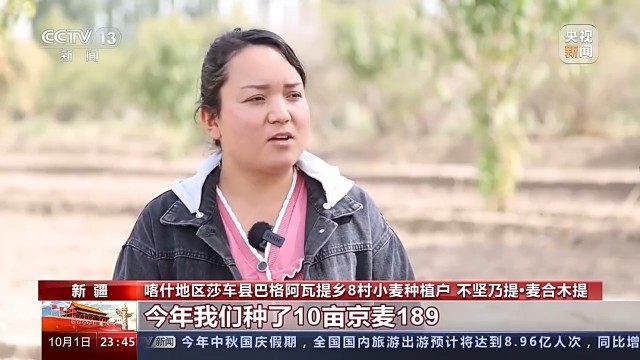 喀什地区莎车县巴格阿瓦提乡8村小麦种植户 不坚乃提·麦合木提:今年我们种了10亩京麦189,这个品种特别好,与老品种相比,一亩地能多收150公斤小麦和麦草,能多卖500块钱。
