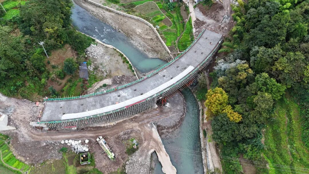 混子Ⅰ号桥位于遵义市汇川区山盆至沙湾农村道路的曲线路段,是该配套项目的控制性节点工程,桥面设计净宽9米,双侧各设0.5米宽护栏,桥梁全长105.5米。面对曲线段施工难点,恒创建设公司采用少支架法施工体系,优化形成“横向多布点、纵向分层次”的支撑方案,确保支架在曲线段受力均匀、整体稳定。为解决桥梁大体积混凝土易开裂的技术难题,项目团队采用“分阶浇筑、两次成型”工艺,通过分层分段施工,有效减少开裂风险,提高结构稳定性。