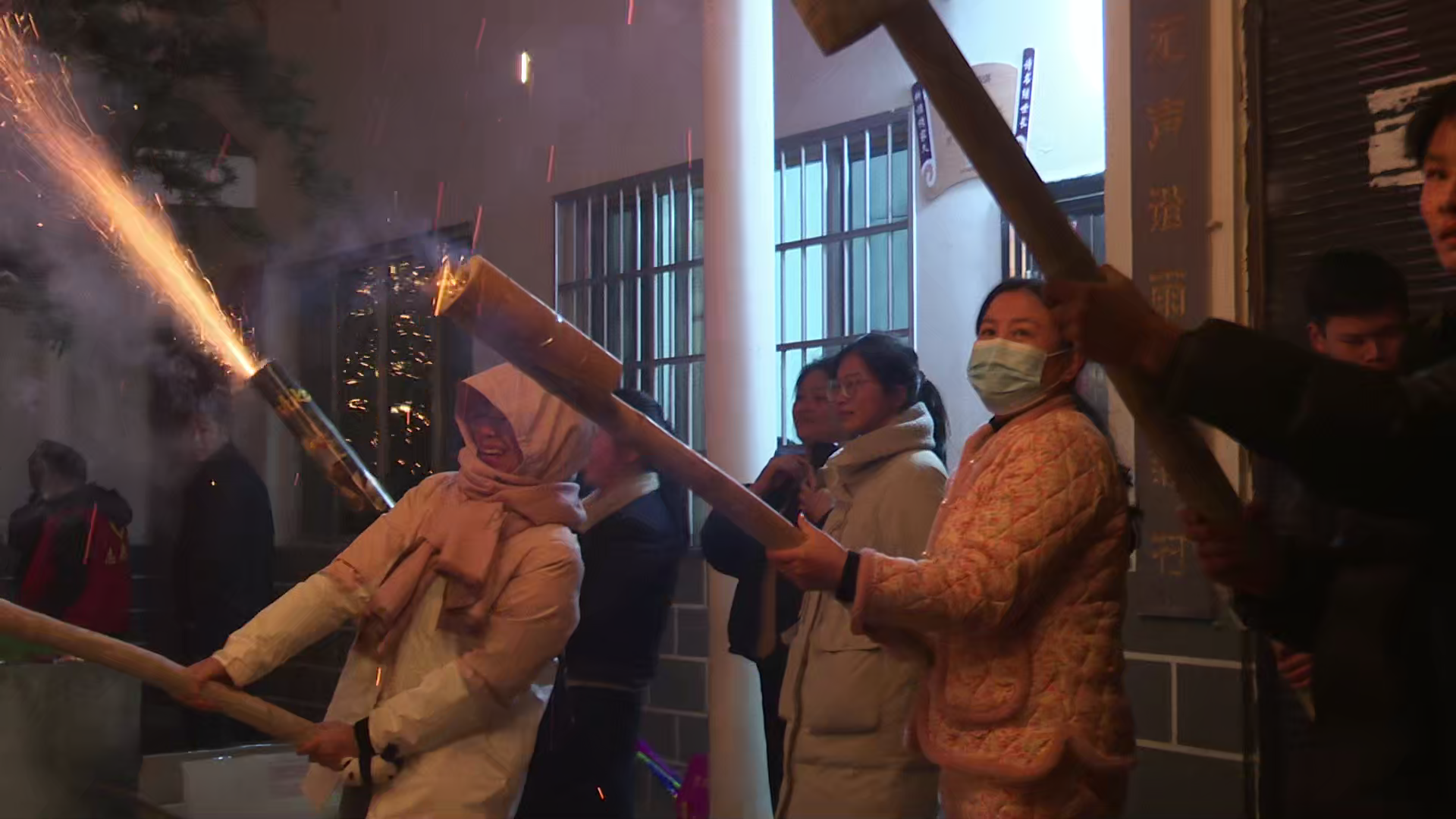 “快,快接龙”“接龙接的就是‘福’呀”,“火龙”快到自家门口时,大家纷纷准备好水果、饮料、蛋类等,站在大门前接龙,祈福许愿。一家老幼各忙各的,点鞭炮、放烟花,体现着一家子对生活的热爱,对未来的期盼。