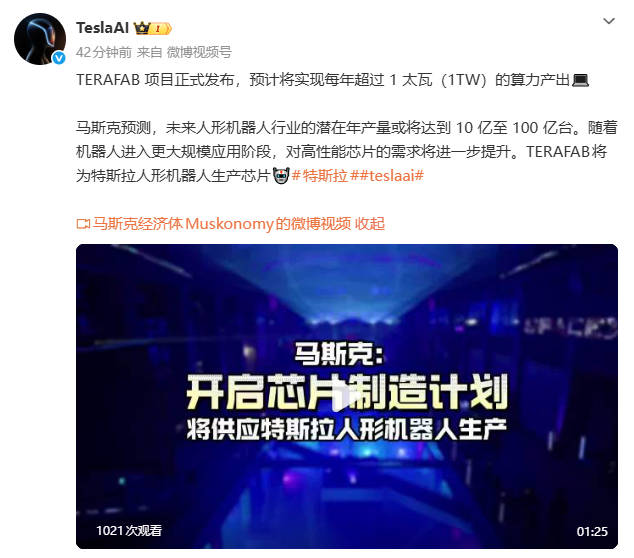 TERAFAB项目正式发布,预计将实现每年超过1太瓦(1TW)的算力产出。