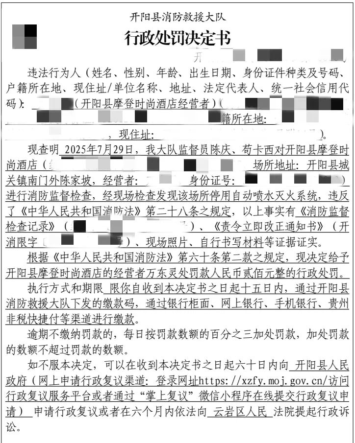 日前,贵阳市开阳县消防防火监督员对开阳县城关镇南门外陈家坡的开阳县摩登时尚酒店进行消防监督检查时发现该场所擅自停用自动喷水灭火系统。